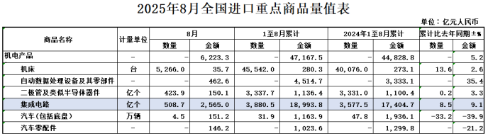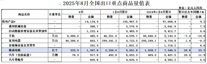 2025年1—8月,我国出口集成电路9051.8亿元,增长23.3%;进口集成电路18993.8亿元,增长9.1%